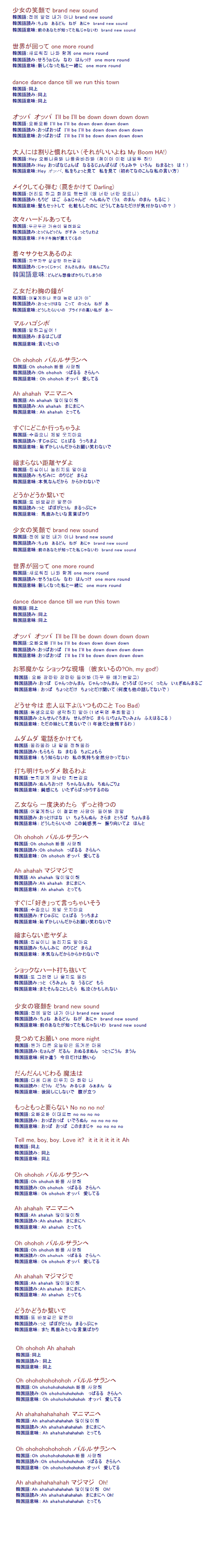 さて、個人的にも好きな「OH!」なので、日本語版の歌詞がどのように翻訳されているのか気になるところ。さっそく、韓国語版と比較してみました。こうやって見てみると、歌詞の意味はぜんぜん違いますね~^^; でも、それぞれの文章の出だしの「音」(発音)が近い単語を選んでいるようで、歌を聞いているときにはそれほど違和感なく聞けるようになっているみたいです。人気な曲だけに、翻訳家の方も苦労したのではないかと思います。それでは比較版、楽しんで頂けると幸いです♪